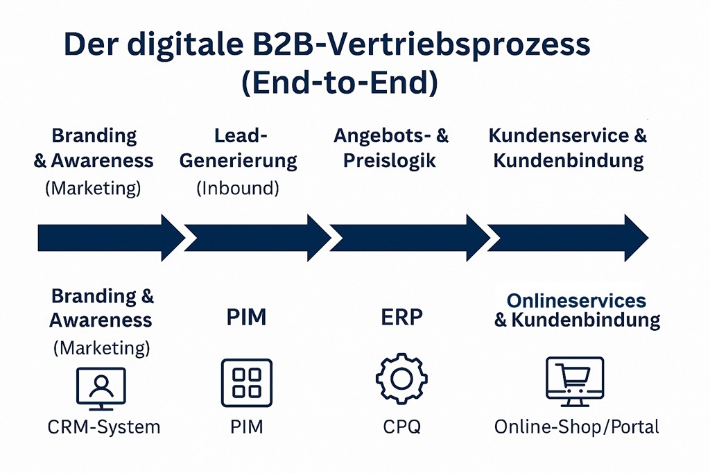 Digitale Systeme wie CRM, PIM oder ERP sind Mittel zum Zweck. Die Kunst besteht darin, sie sinnvoll miteinander zu vernetzen, damit aus Daten Entscheidungen und aus Prozessen Ergebnisse entstehen. Die Digitalisierung im B2B-Vertrieb beginnt also nicht mit der Softwareinstallation, sondern mit der Frage: Wie entsteht ein Auftrag, und an welcher Stelle hakt es im heutigen Ablauf?