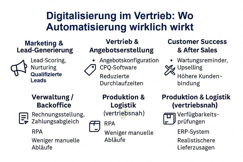 Was automatisieren? Angebotskonfiguratoren (CPQ), Preislogiken, Freigaben, Vertragsgeneratoren, Vorerfassung von eingehenden Bestellungen.