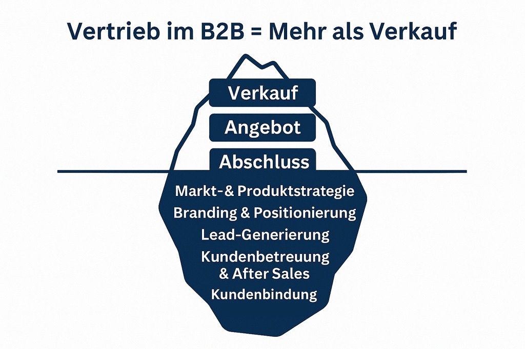 Traditionell wird Vertrieb häufig mit Verkauf gleichgesetzt: Außendienst, Angebot, Abschluss. Doch dieser Fokus greift längst zu kurz. Im B2B entstehen Käufe selten spontan. Entscheider recherchieren, vergleichen, diskutieren intern und suchen erst nach Kontakt, wenn der Bedarf konkret ist. Der eigentliche Verkaufsprozess ist damit nur die Spitze des Eisbergs. Der Großteil der Vertriebsleistung liegt darunter: in Strategie, Marke, Marktverständnis und systematischer Kundenentwicklung.