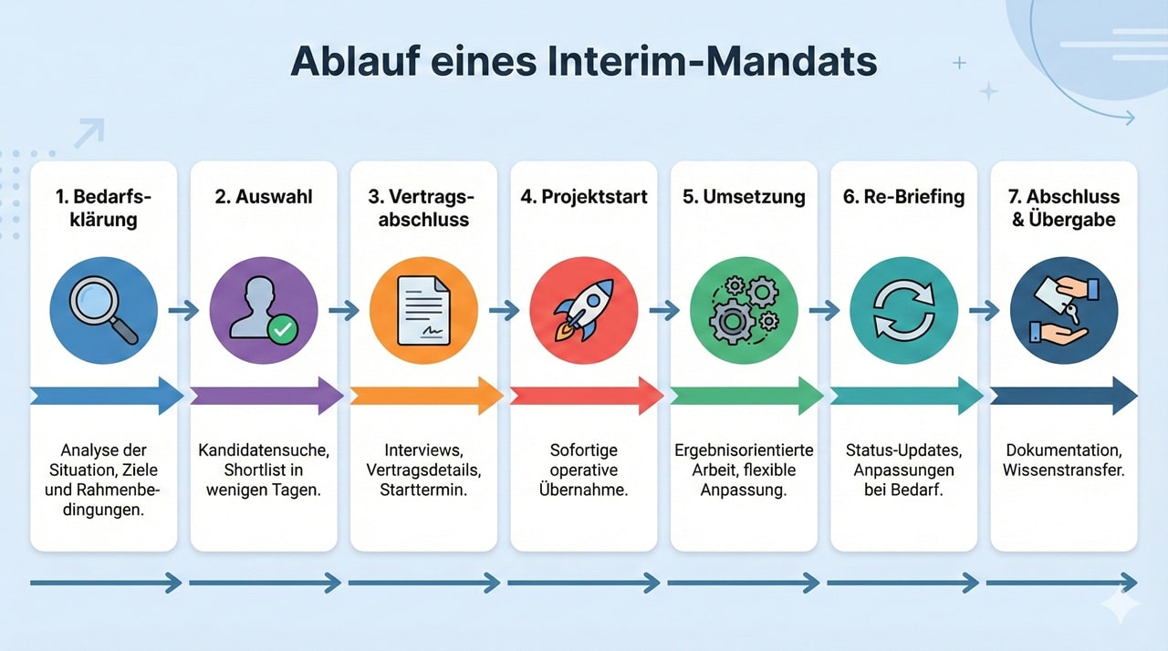 Über direkte Ansprache, spezialisierte Interim Management Provider (z. B. Atreus, DDIM, Interim-Profis) oder Netzwerke erfolgt die Kandidatensuche. Innerhalb von 48 Stunden bis wenigen Tagen liegt eine Shortlist vor. Interviews und Vertragsabschluss dauern meist weniger als eine Woche.